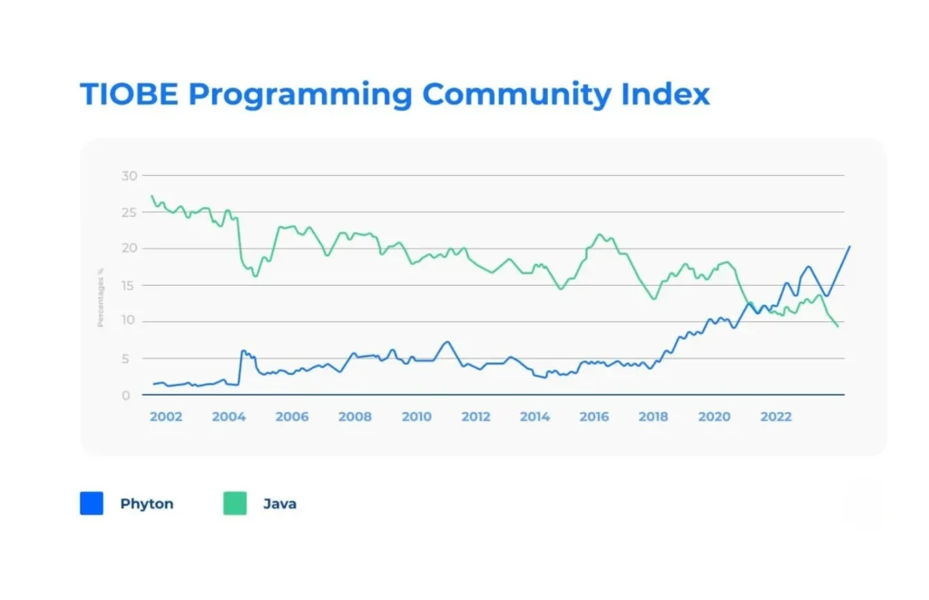 Both Python and Java have long been among the most widely used programming languages, as this article has already said. Python is now the most popular language, with Java coming in at number four on the TIOBE index. To put this into context, five years ago, the circumstances were entirely different: Python came up at number four in this ranking, while Java was at the top.
